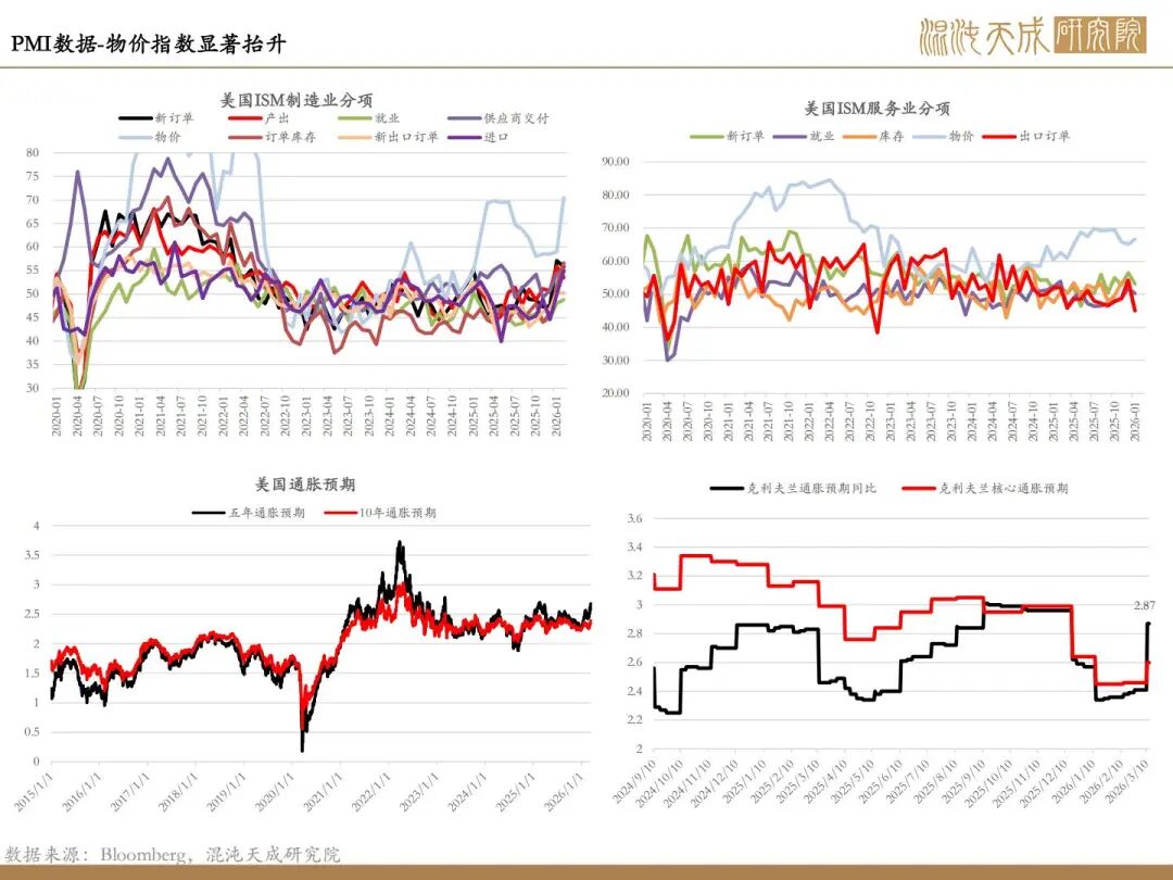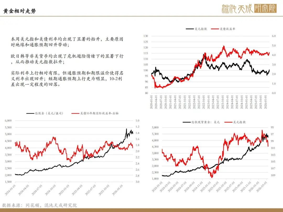 美元指数的冲高:本周美伊冲突使得各国权益市场明显承压,其中日韩股市更是受到前期高杠杆和高外资比的影响,在出现短线级别的显著下跌后引发连锁行情,并进一步引发流动性风险上行。欧日韩汇率均出现不同程度的走弱,而作为避险货币的美元出现显著的拉升 ,一度冲击100,这对非美市场产生实质性流动性风险,并抑制贵金属走势。