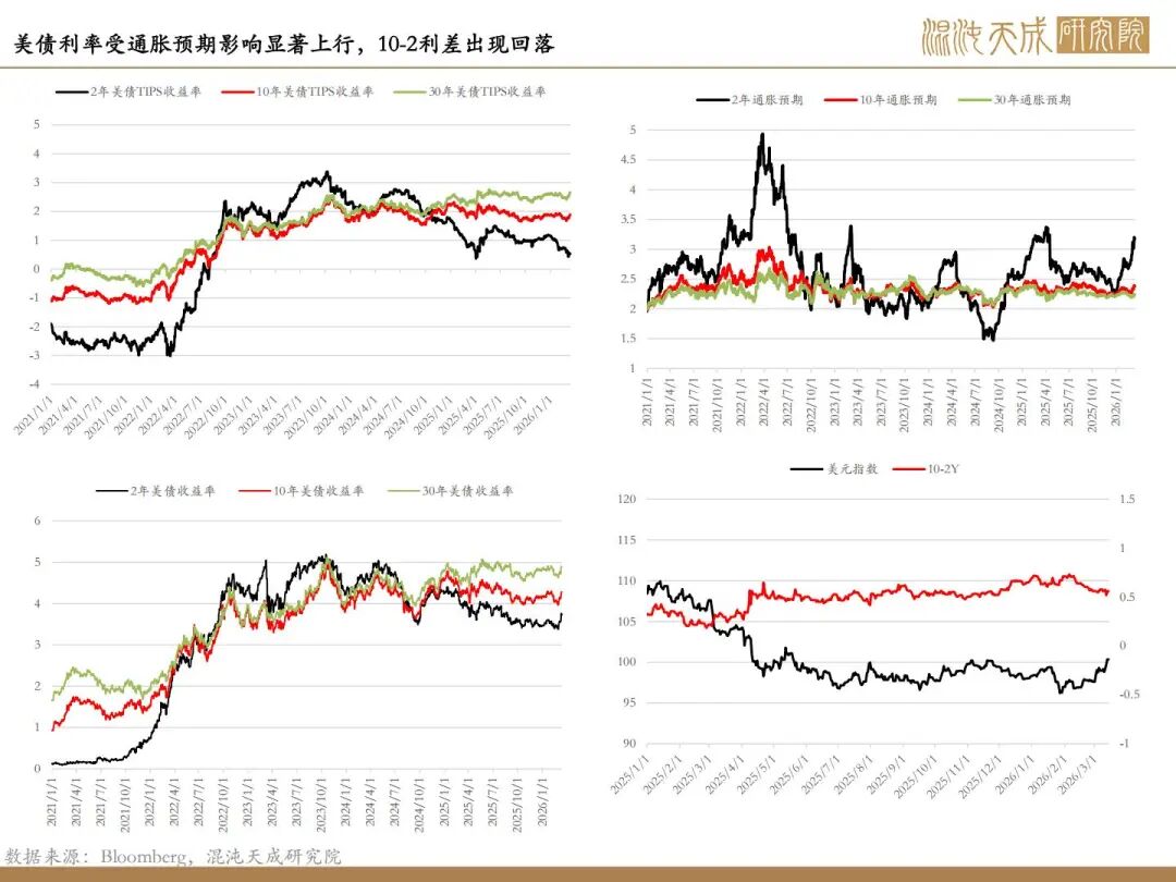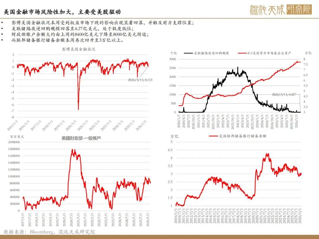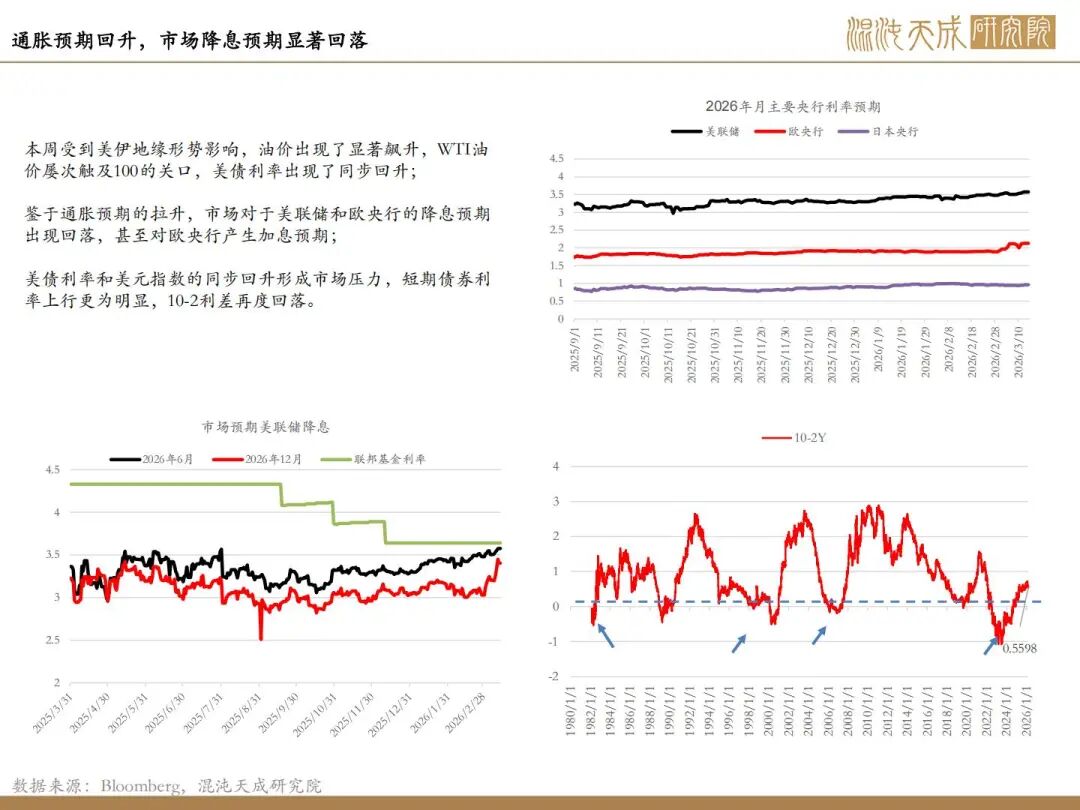 降息预期的显著回调抑制市场:本周随着美伊局势形成的霍尔木兹海峡封锁预期导致的油价大幅走高,通胀预期出现了显著的抬升,反复试探100美元的关键关口,这使得全市场对于未来的通胀预期上行,对于美联储和欧央行的降息路径产生转变。债券利率出现抬升后,权益市场显著承压,对市场流动性形成明显的抑制影响。但是本周能明显观察到市场对于美股和流动性的相对“呵护”,在急跌中屡次“救市”,并相对控制住风险的进一步蔓延,形成底部支撑。